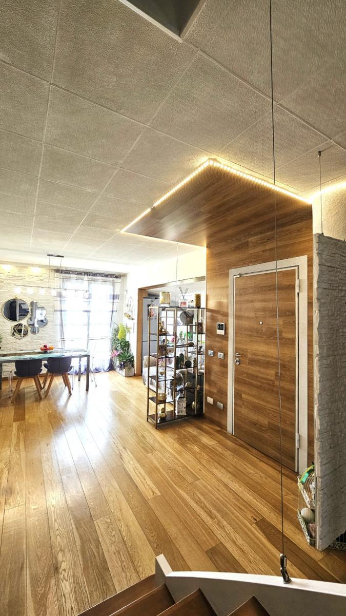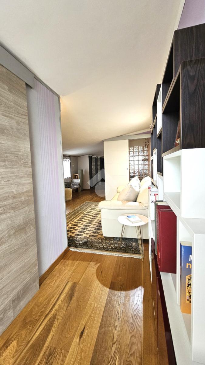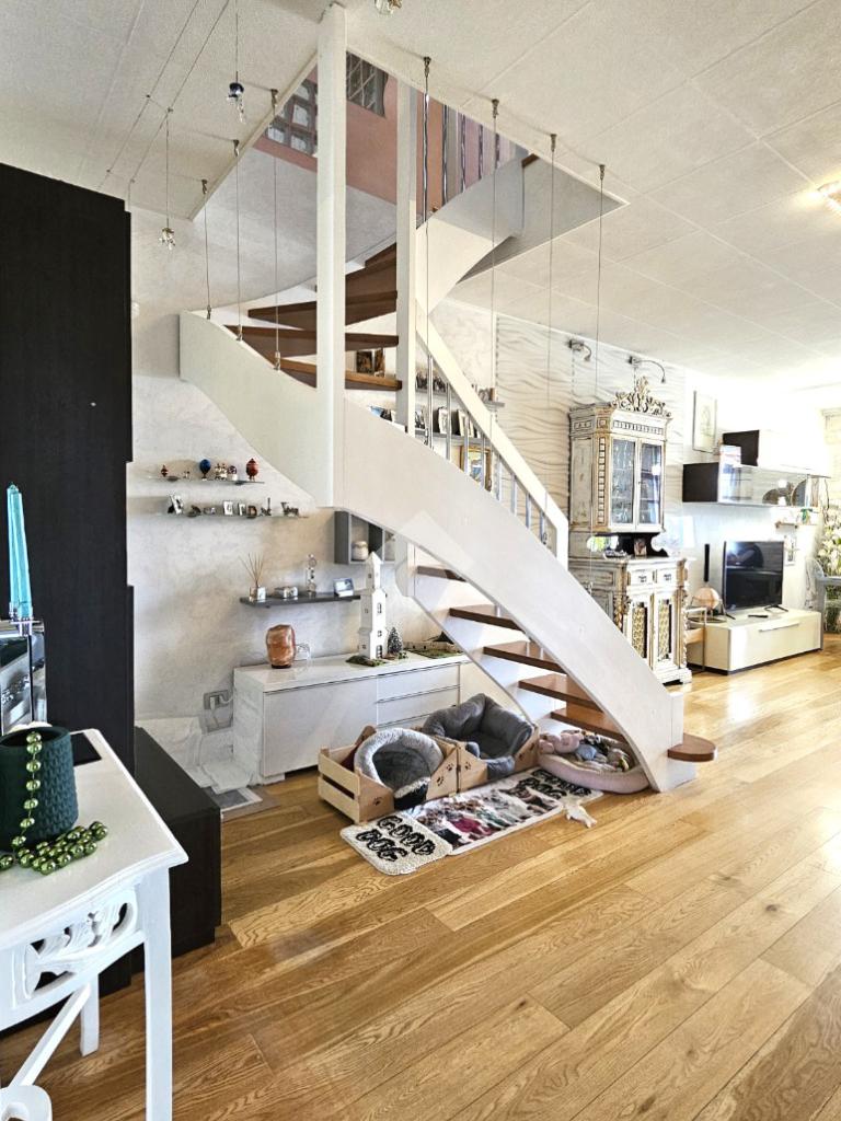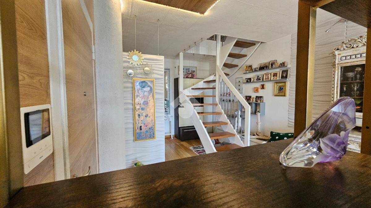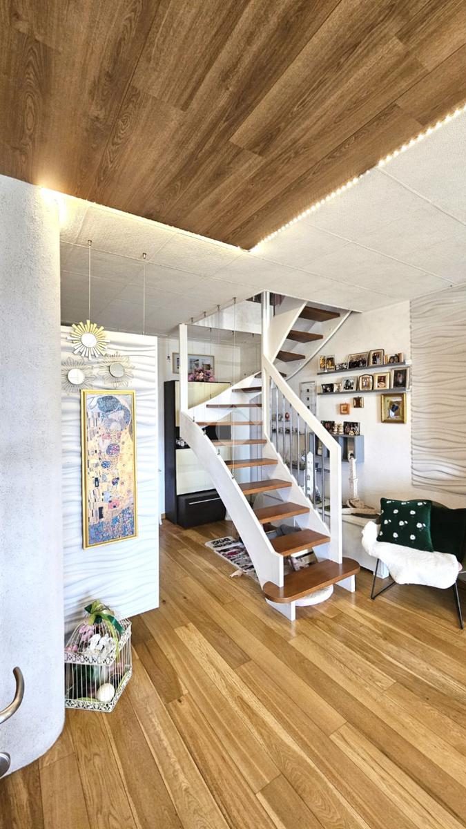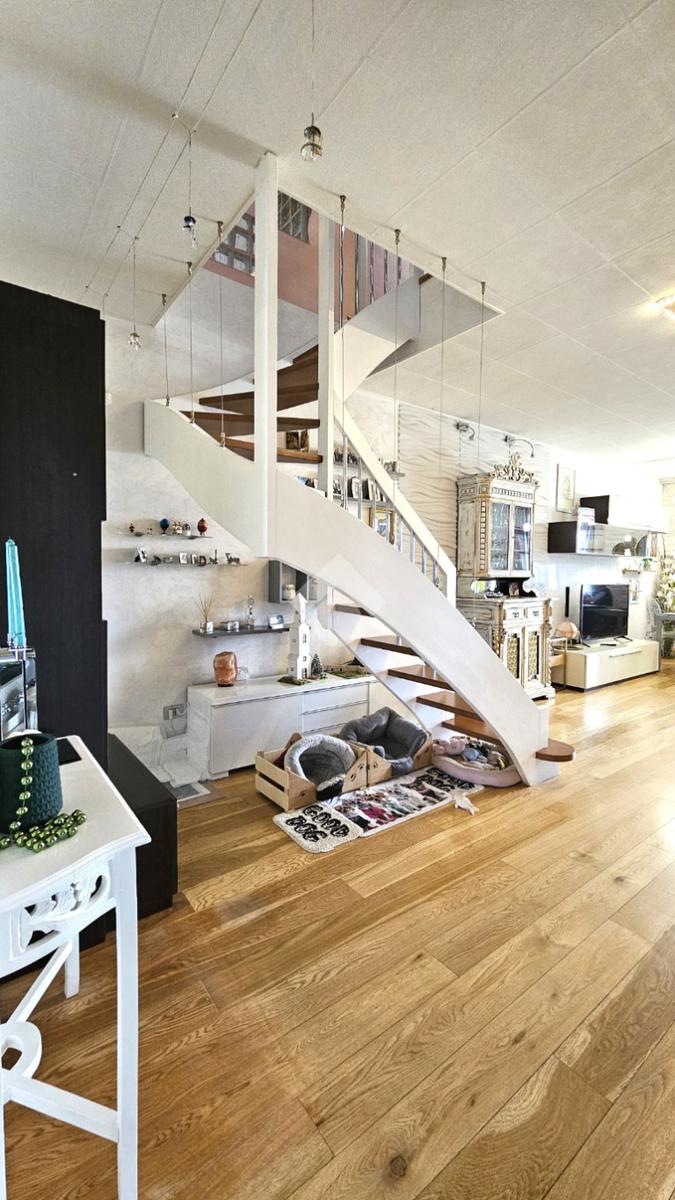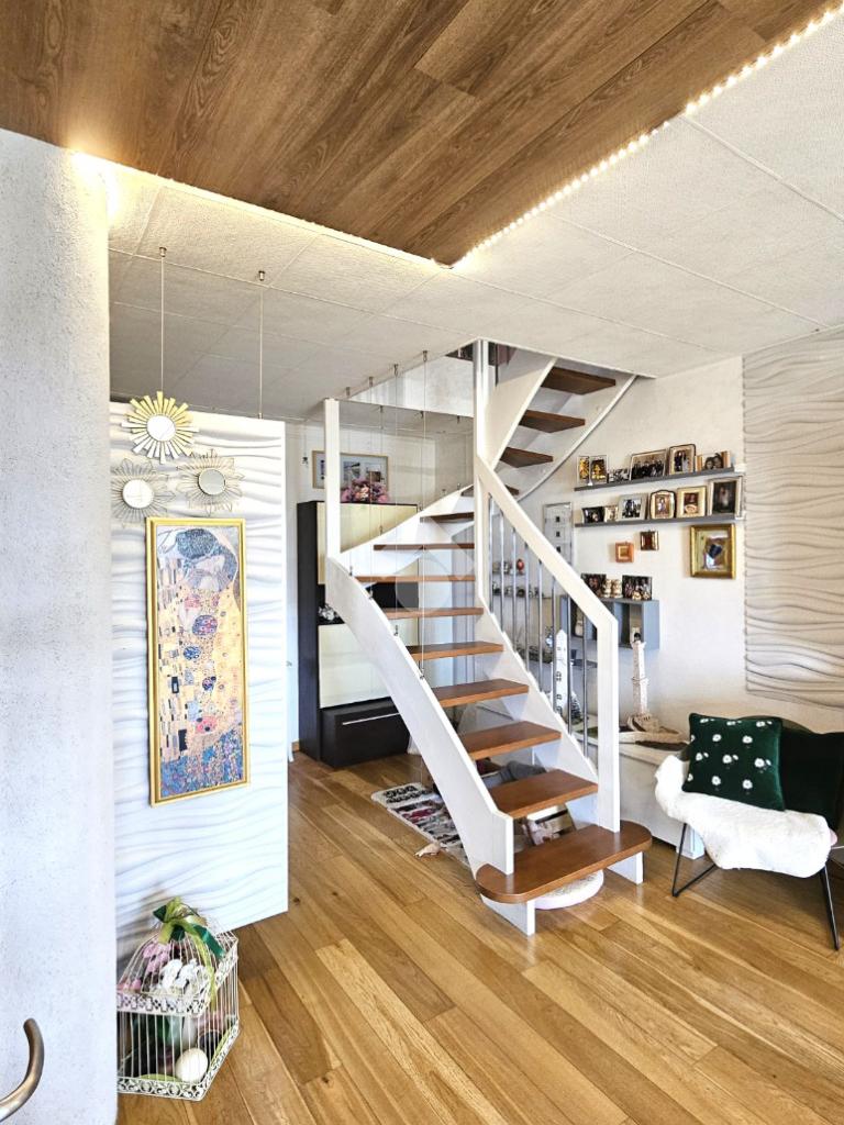 L’abitazione si sviluppa su 144 mq commerciali: al primo piano veniamo accolti da una luminosa zona living con cucina a vista, camera matrimoniale con cabina armadio/ripostiglio, bagno e due balconi. Una comoda scala interna di assoluto design architettonico conduce alla mansarda, un ambiente versatile e spazioso che ospita una seconda zona giorno, un’ulteriore camera matrimoniale, un bagno e due balconi.